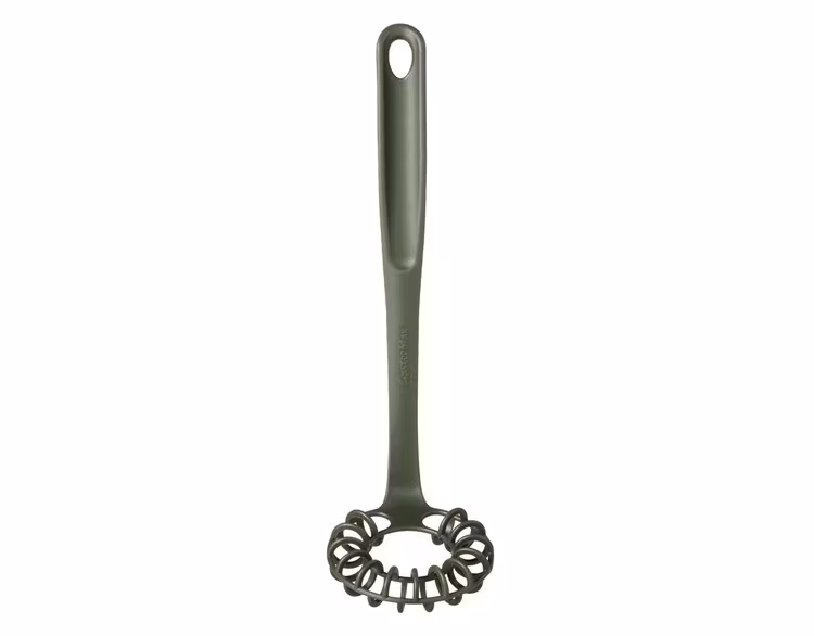 Visp i bio-plast som når alla delar av stekpannan eller kastrullen. Lämplig för non-stick ytor. Gjord av bio-baserad plast, glasfiber och amidplast. Mindre än 50% av koldioxidatrycket från traditionella plastredskap.