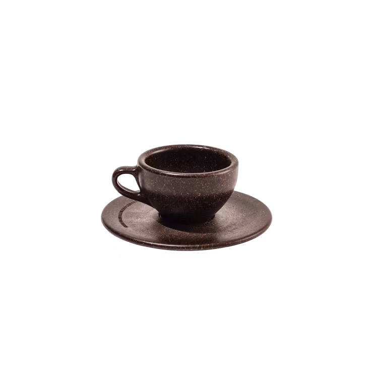 Den unika kaffekoppen med fat som är gjord på använda kaffebönor. Kaffesumpen har samlats in från cafeer i Berlin och utgör basen i dessa handgjorda kaffekoppar.