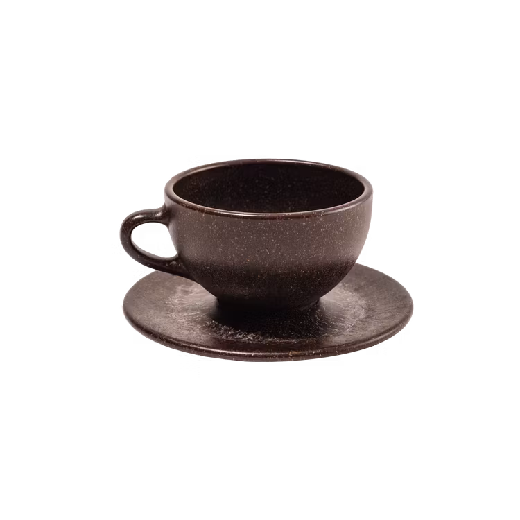 En unik handgjord kaffekoppen med fat är gjord på använda kaffebönor. Kaffesumpen har samlats in från cafeer i Berlin och utgör basen i dessa kaffekoppar.