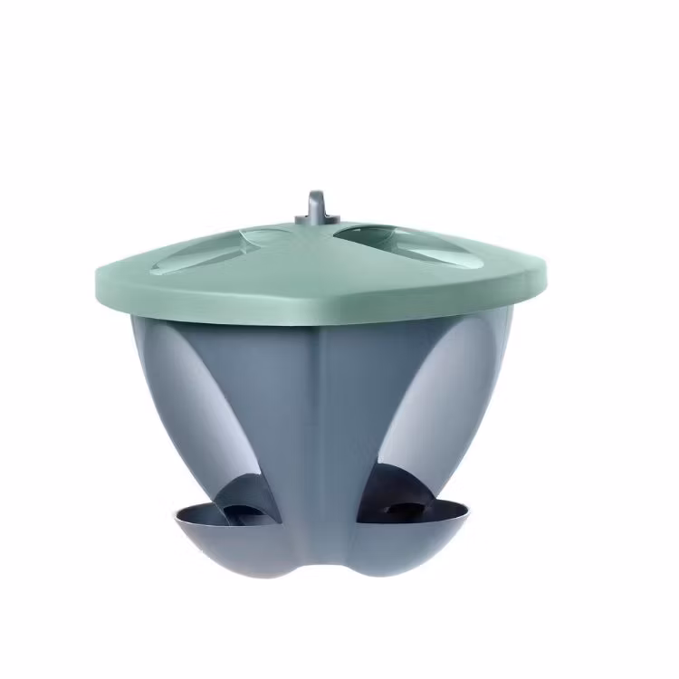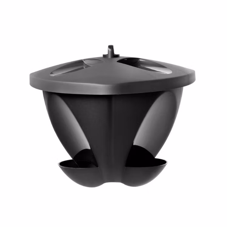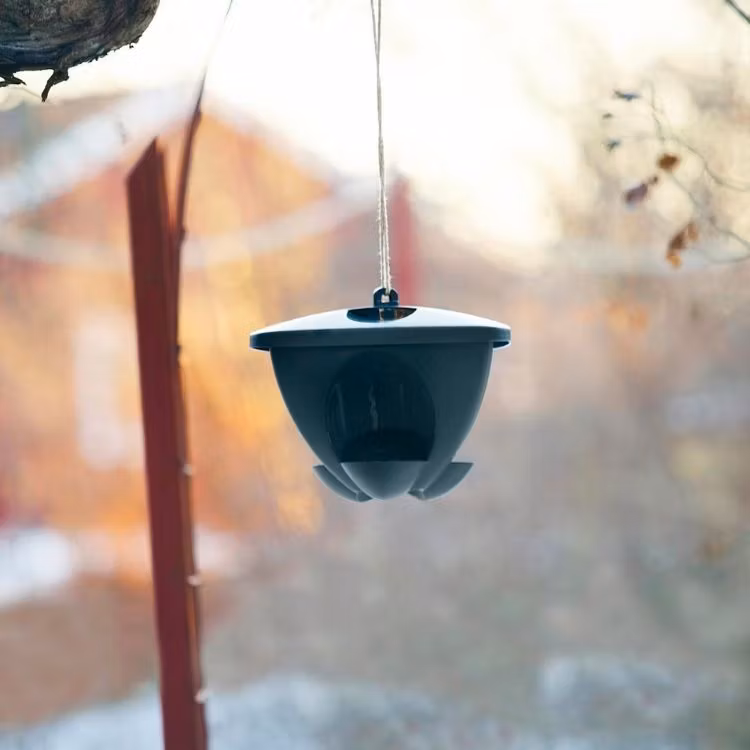 Rymlig fågelmatare, designad för att förhindra oönskat besök från katter, ekorrar och större fåglar. Liten landningsplats förhindrar fågelspillning att hamna i maten, vilket kan orsaka salmonella. Kan monteras på pinne eller hängas upp i en krok eller ett snöre i ett träd. Tillverkad av återvunnen plast i Sverige.