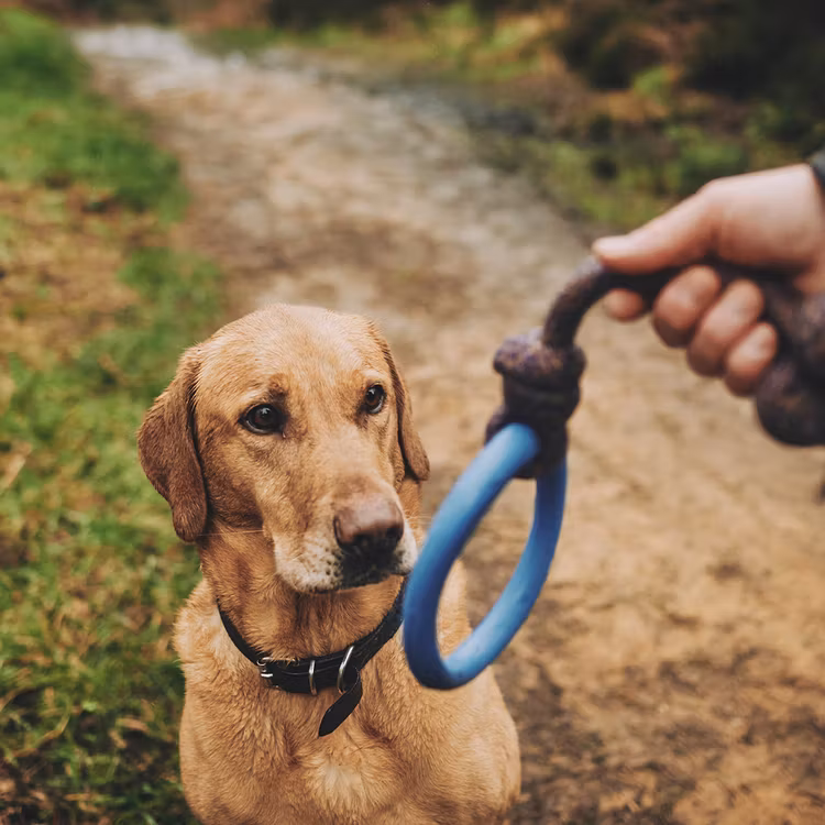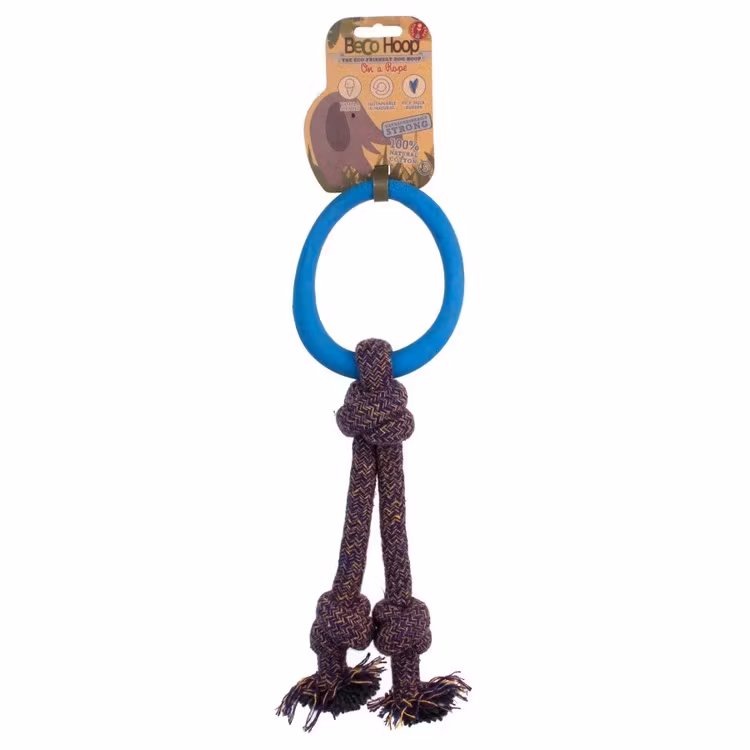 Låt dragkampen börja! Den mjuka ringen i naturgummi är snäll mot din hunds tänder och repen ger dig ett bra grepp i dragleken.