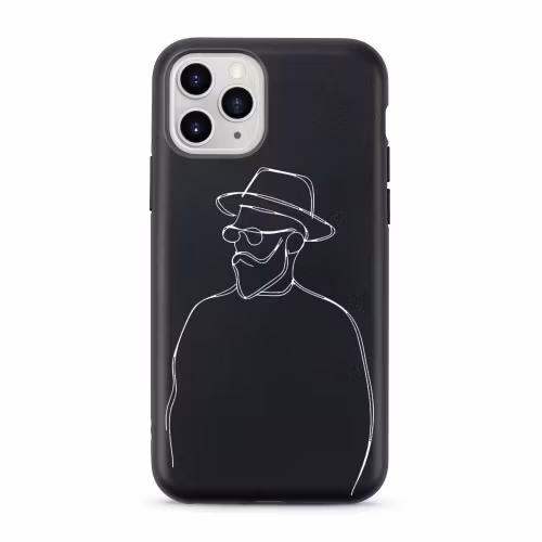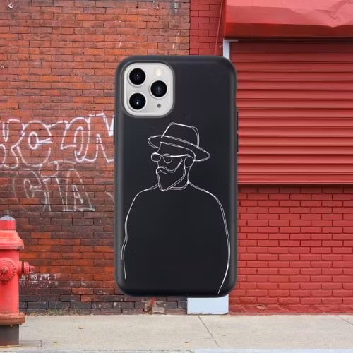 Det här svarta miljövänliga mobilskalet med vit screentryck av en trendig hipsters i hatt är tillverkat i 100% biologiskt nedbrytbar plast (PLA) och skyddar din mobil från fall, repor och vatten.