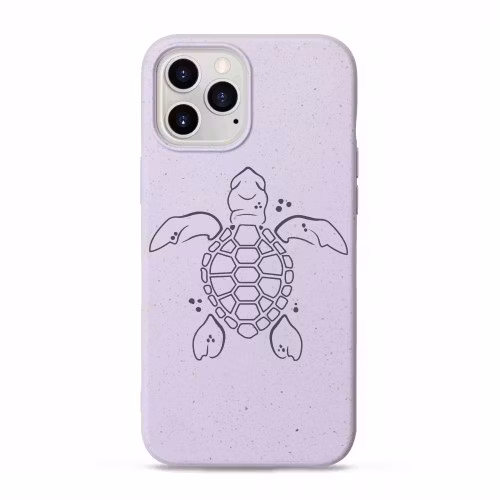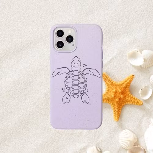 Det här lila skalet med uv-skyddat screentryck med en sköldpadda är tillverkat i 100% biologiskt nedbrytbar plast (PLA) och skyddar din mobil från fall, repor och vatten.