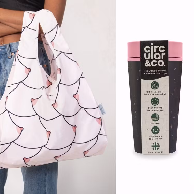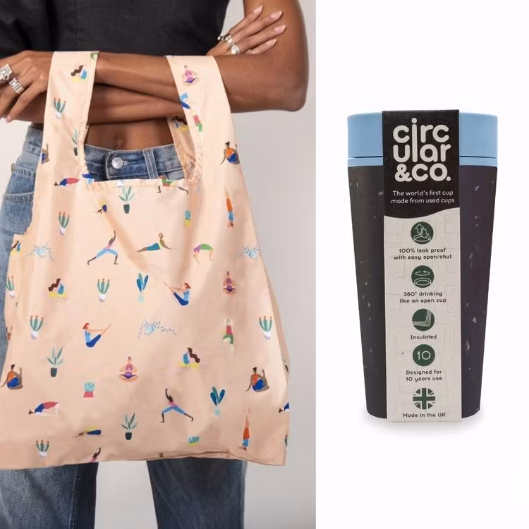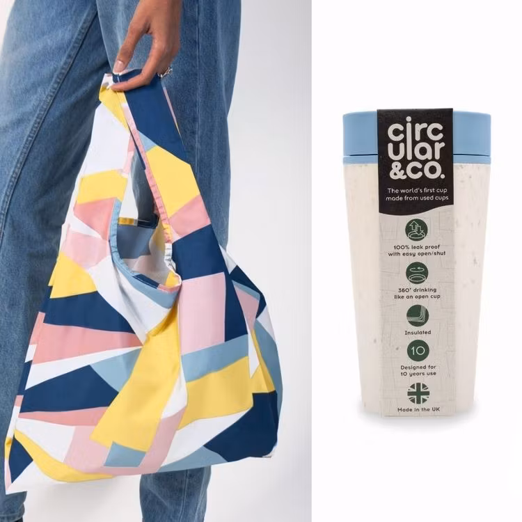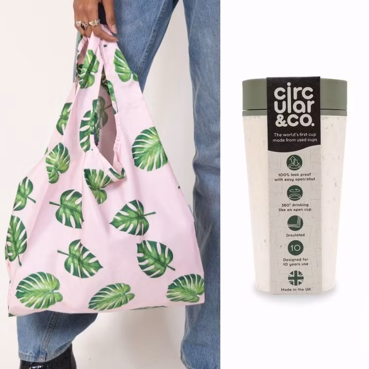Perfekt barnvagnspromenad set med en praktisk Take Away mugg från Circular&Co och Shopping bag från KIND BAG.