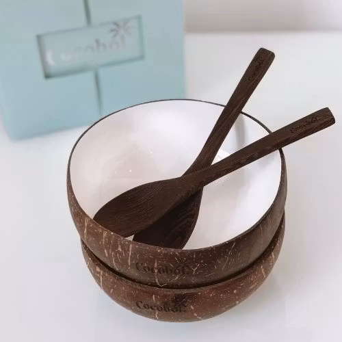 Presentset med två stycken kokosskålar och två stycken skedar. Välj vilken färg på skålarna du vill ha. Setet levereras i en fin turkos presentbox med Cocobols logga.