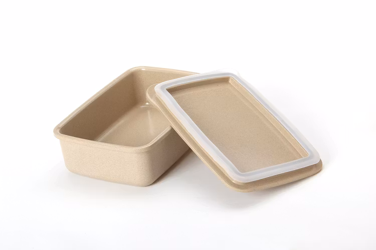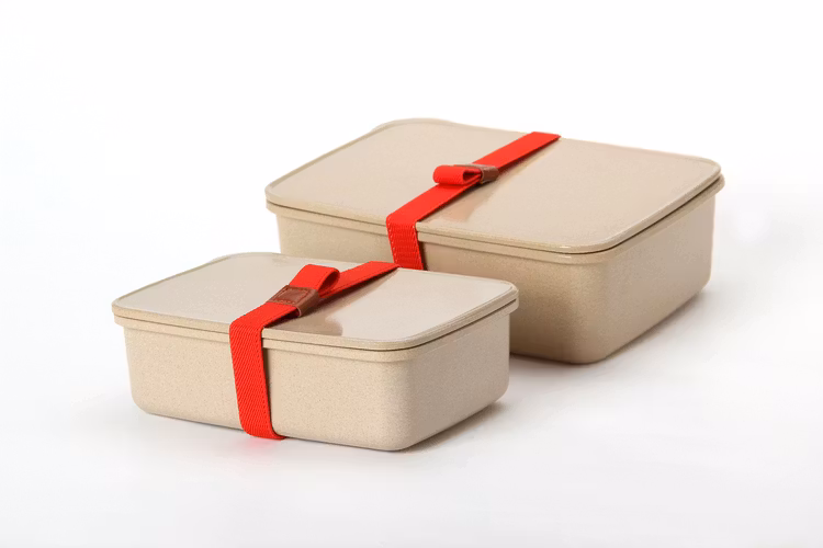 Praktisk matlåda med tätslutande lock och tillhörande sked i det miljövänliga och giftfria materialet rishusk.