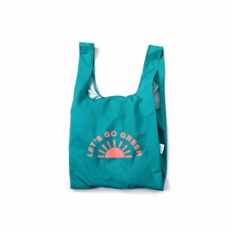 Klimatsmart återanvändbar shoppingkasse från brittiska KIND BAG. Kassen är gjord av 6 återvunna PET-flaskor. Med texten Go Green mot grön bakgrund.