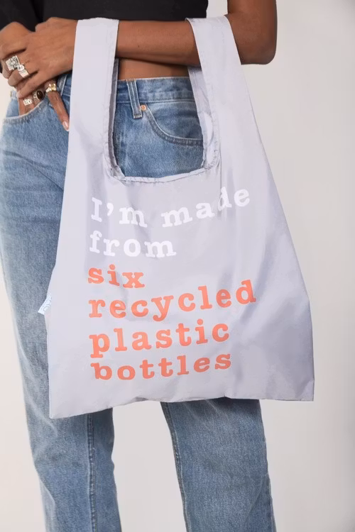 Klimatsmart återanvändbar shoppingkasse från brittiska KIND BAG. Kassen är gjord av 6 återvunna PET-flaskor. Motiv Recycle.