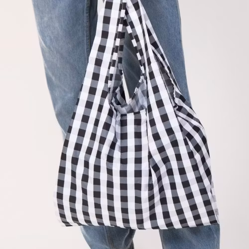 Rutig klimatsmart hopvikbar shoppingkasse från KIND BAG. Kassen är gjord av 6 återvunna PET-flaskor. Använd som strandkasse, shopping bag eller extra väska.
